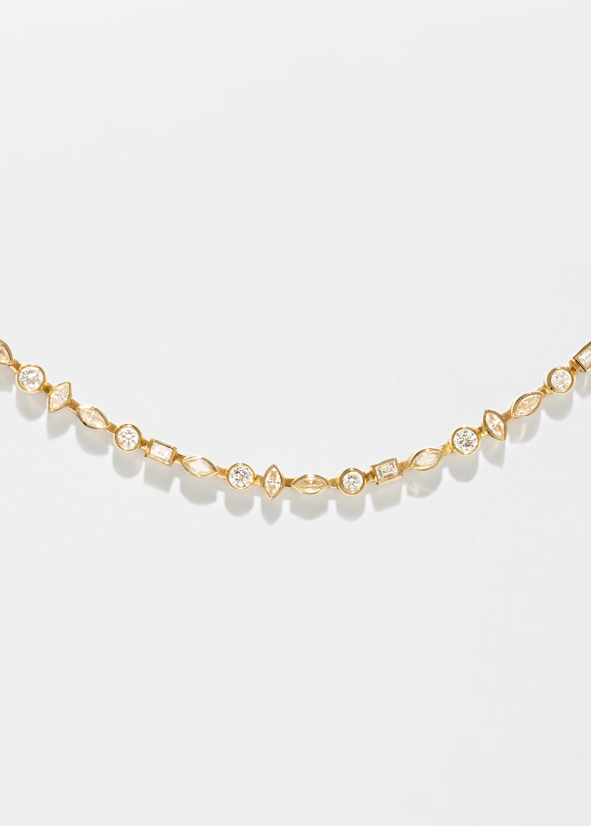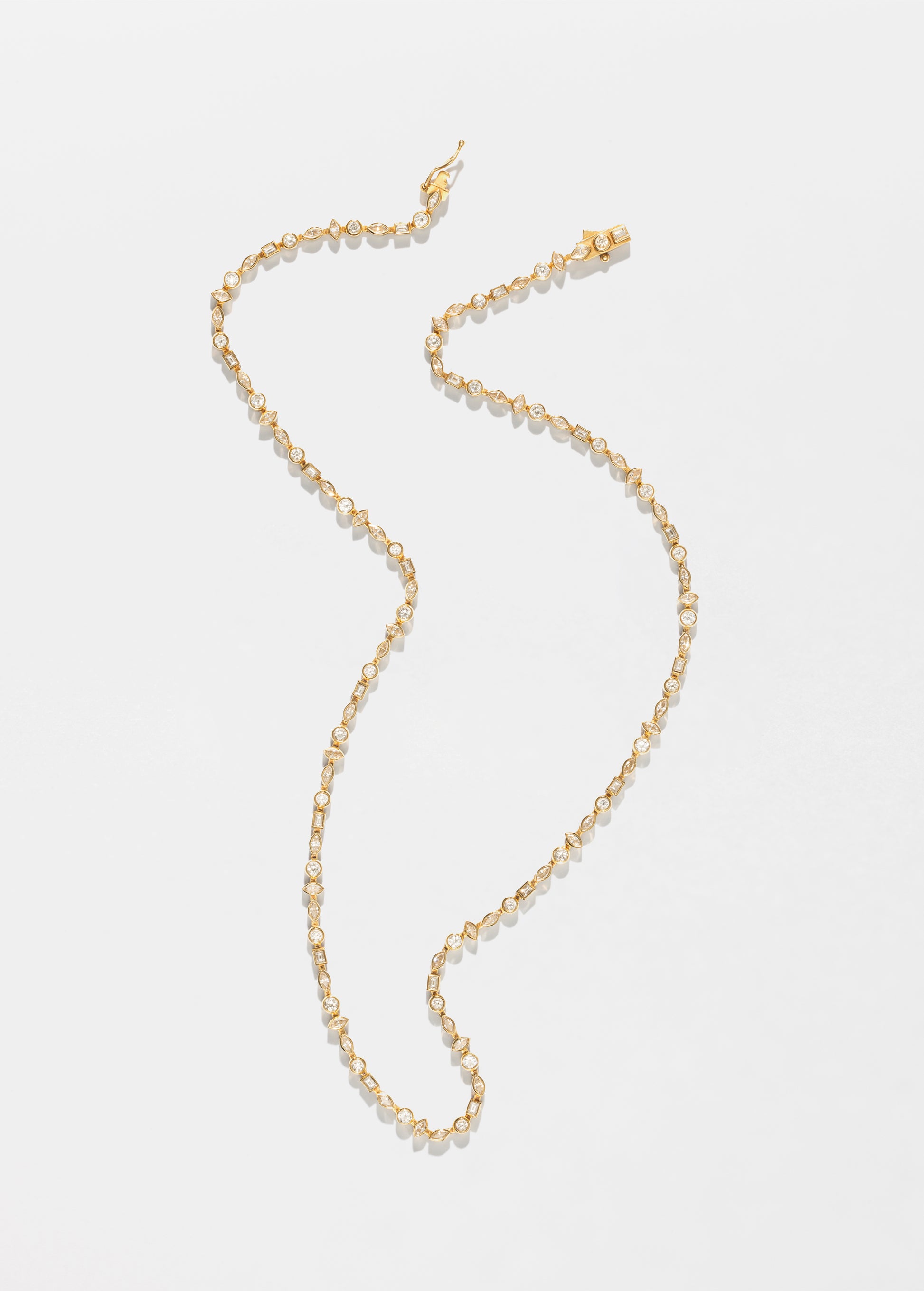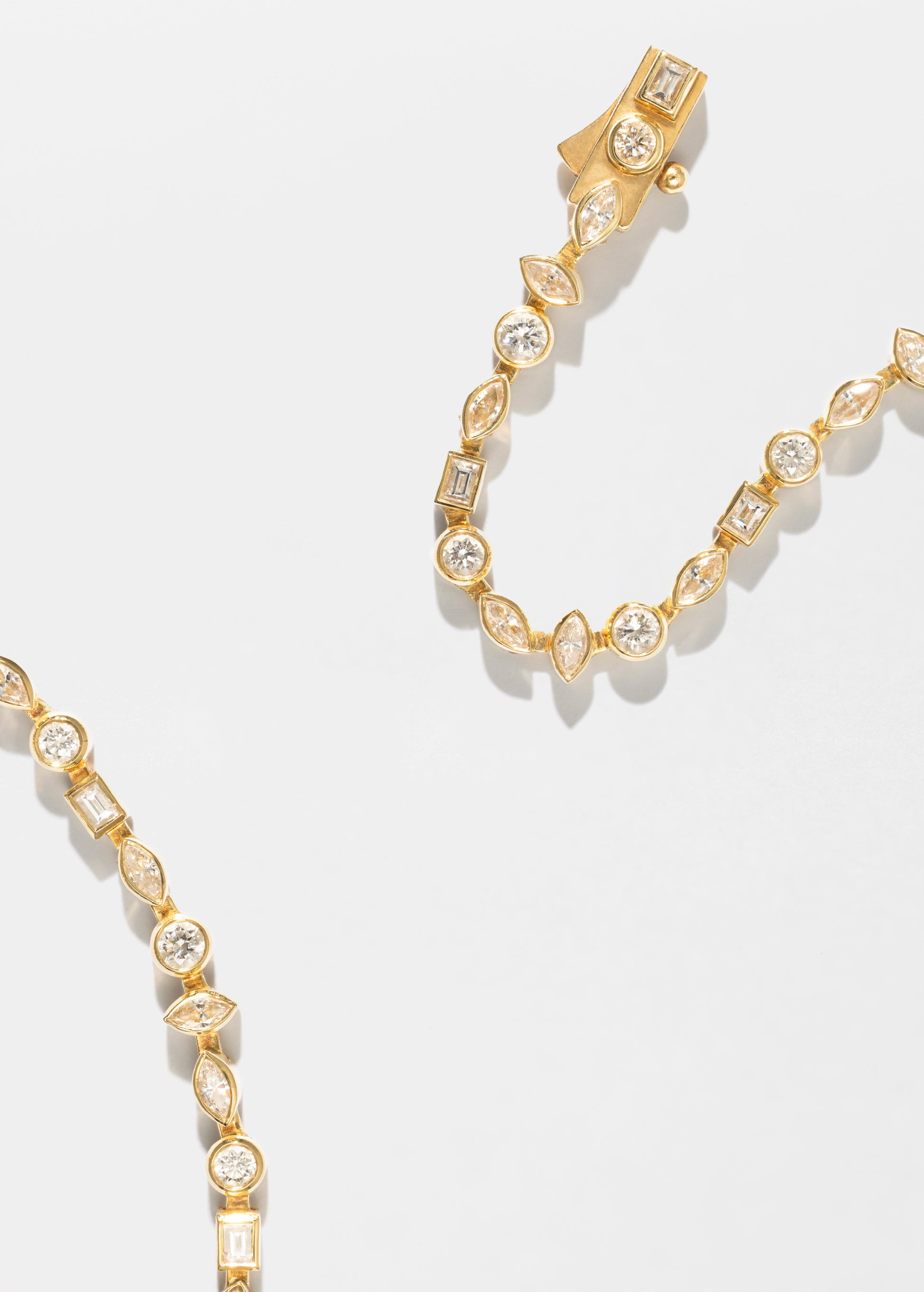 Fabricado em 18 de ouro amarelo reciclado com um total de 4,56 quilates de diamantes VS , incluindo 19 diamantes de 2,10 mm presos entre eles, 19 baguetes de 2 x 1,5 mm, 57 navetes de 3 x 1,5 mm e 19 diamantes de 2,50 mm.